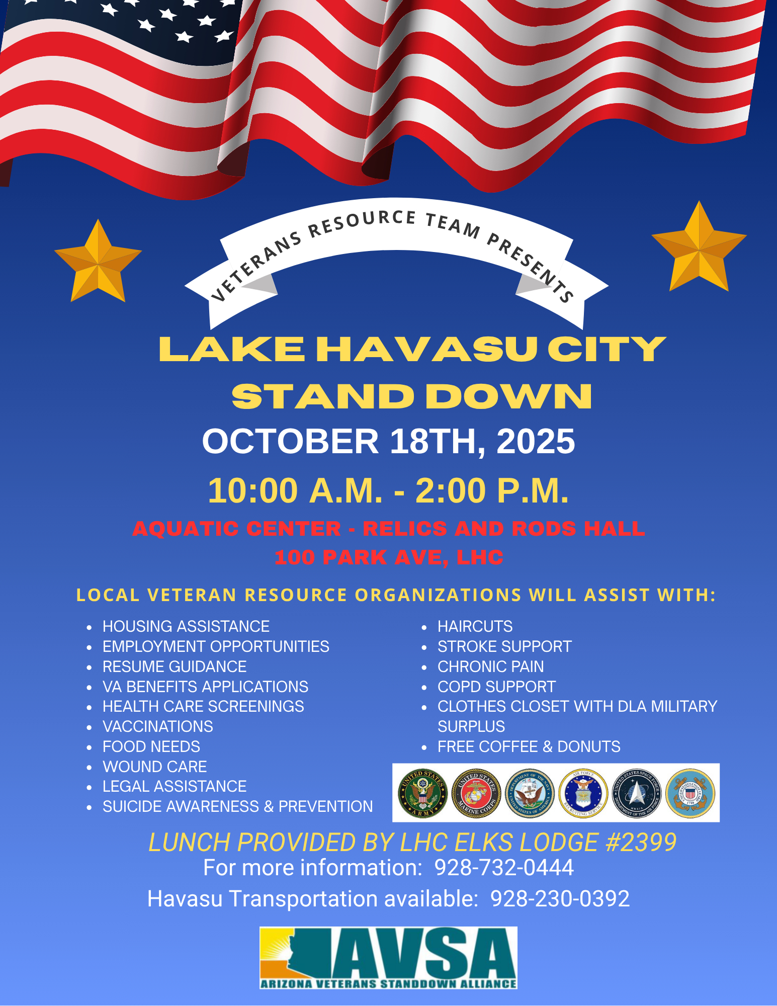 Join Cochise Serving Veterans on Saturday, October 18, 2025, at the Rods and Relics Room Aquatic Center in Lake Havasu Arizona for a day dedicated to honoring and supporting our veterans. The event runs from 10:00 AM – 2:00 PM. Free coffee and donuts. Lunch will be provided by LHC Elks Lodge #2399.