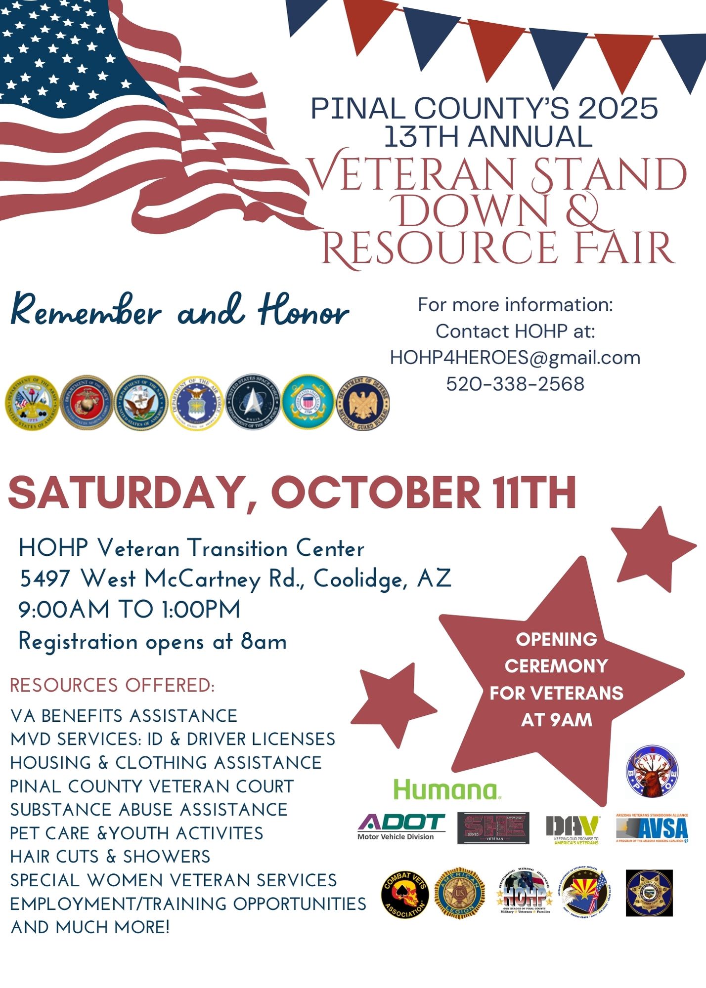 Join Pinal County on Saturday, October 11th, 2025 at the HOHP Veteran Transition Center in Coolidge for a day dedicated to honoring and supporting our veterans. The event runs from 9:00 AM – 1:00 PM (registration opens at 8:00 AM), with a special opening ceremony at 9:00 AM.